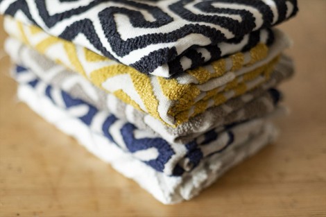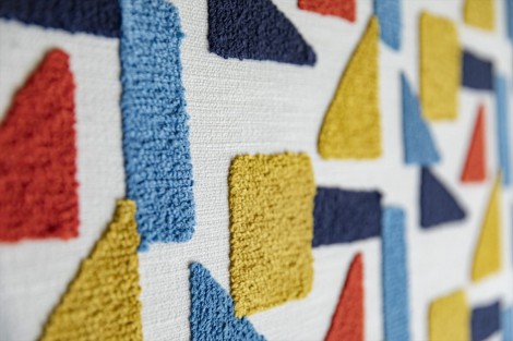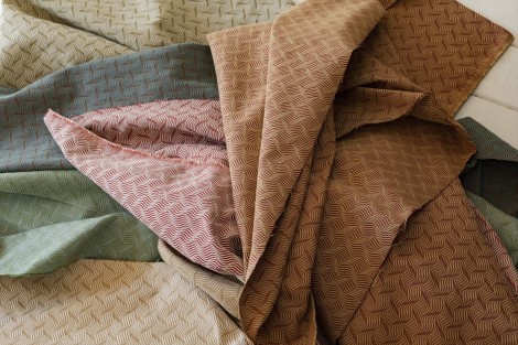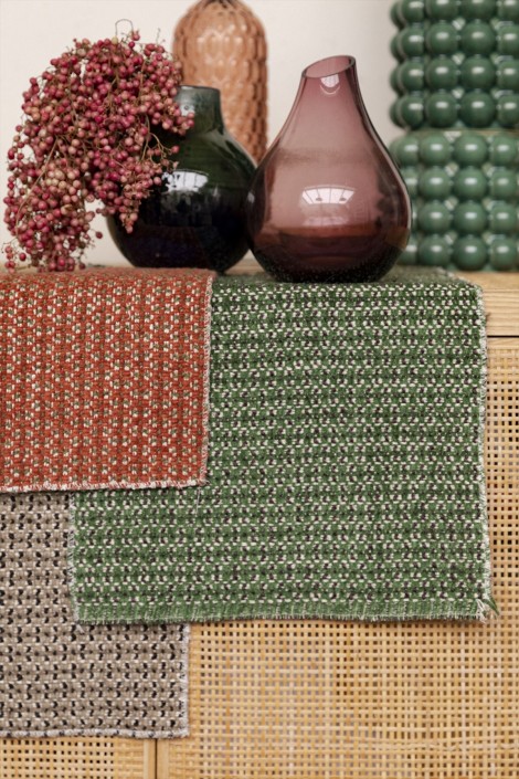 シュニール糸を使ったジャカード織り生地です。ちょうどよい大きさの幾何学デザインでオークルからグリーン、グレー、ブルーまで幅広い色展開です。椅子張り、カーテン、アクセサリーにご使用いただけます。