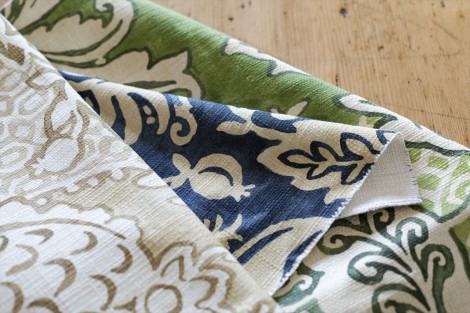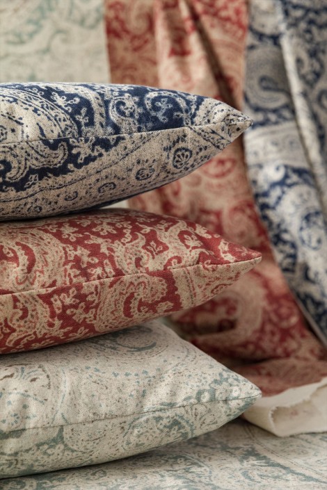 ペルシャ語で涙を意味するBotehは、ペイズリー柄をモチーフにしたプリント生地です。アジアンプリントを彷彿とさせるものでインテリアとして再流行しています。リネンとコットンををベースにしたデザインで、カラーはブルー、アクアグリーン、赤みがかったトーンの3色です。