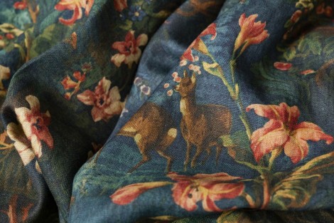 伝説でロビン・フッドとその仲間たちが身を隠していたと言われるロンドンとスコットランド国境の中間にある小さな森Sherwoodから名前を取ったエレガントな大柄のプリント生地です。