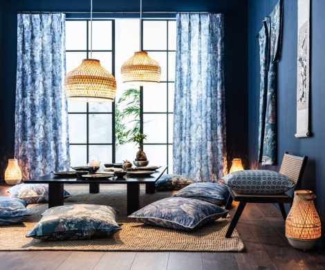 Shibuiは日本の伝統的な芸者を描いています。Shibui(渋い)という言葉は、女性の控えめな美しさを象徴しています。高級感のあるポリエステル・コットン混生地にプリントされています。Anthracite, Mist Grey, Parchment, Porcelain, Sapphire, Willowの5色展開です。インテリアに華やかさを添えてくれます。
