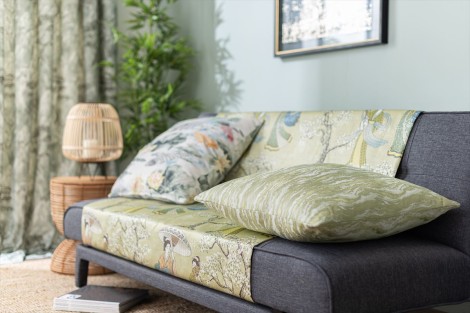日本の伝統からインスピレーションを受けたEregantoコレクションは文字通り日本語のエレガントを表現しています。お客様を日本への旅に誘うようなコレクションです。豊かなカラーパレットと本格的なハンドペイントのデザインでラグジュアリーな洗練されたコレクションです。ベルベット、フェイクシルク、厚手のリネン、コットン混生地にプリントすることで、豊かなテクスチャーと立体感を表現しています。さらに凝った刺繍を施すことで特徴的なデザインを作り出しています。カラーパレットは、ゴールドとくすんだ黄緑色に深いラグーンブルーとサファイアを組み合わせ、ラグジュアリーでスタイリッシュな雰囲気を醸し出しています。クラシックなシノワズリブルーとアースカラーのトープやストーンの配色でコレクションを完成させています。