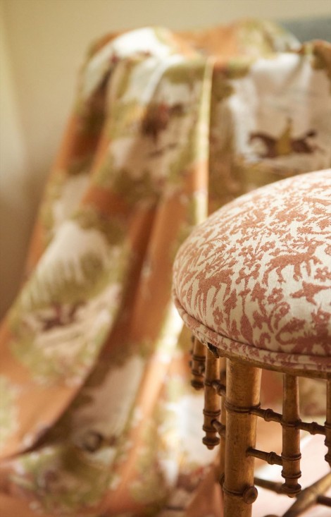 エレガントなトワルドジュイ柄の生地です。狩猟のモチーフや自然の要素を取り入れたクラシックなデザインからインスピレーションを得ています。印象的なカラーがクラッシックな色彩に現代的な魅力を添えています。