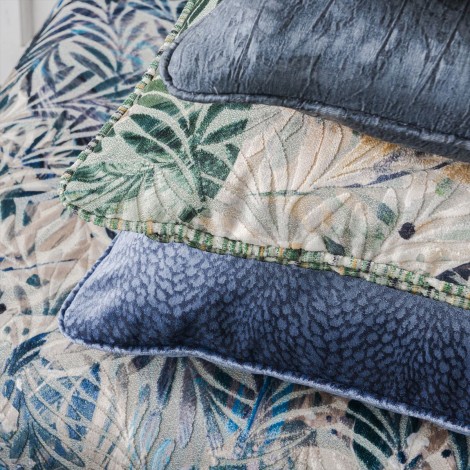 花柄、葉柄、イカット柄、幾何学柄など5種類のプリント・デザインがあり、すべてサステイナブルなBCIコットンにプリントされています。 これに華やかな8色のジャカード柄ベルベットを組み合わせ、アール・デコ調のひねりを加えました。