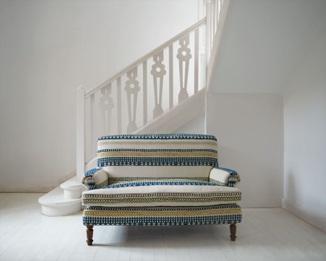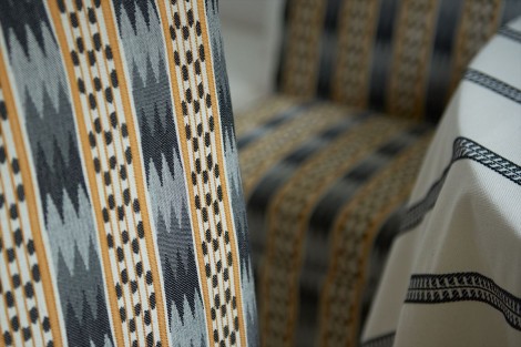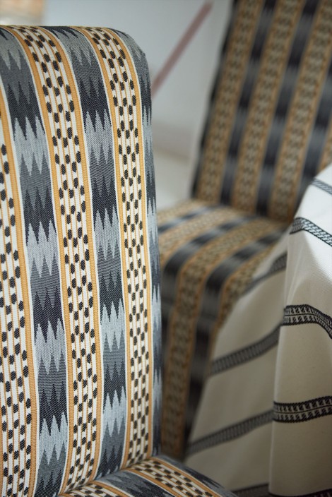 古典的なストライプ・デザインにエスニック・モチーフの華やかさを組み合わせ、伝統的なストライプに独創性とエキゾチシズムのタッチを加えています。