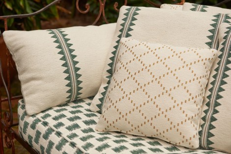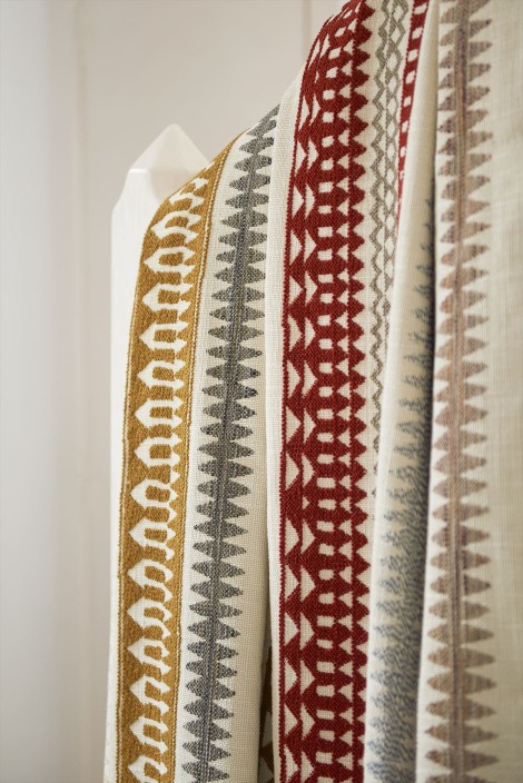 ジャカード織機と高番手のシェニール糸を組み合わせ、バスケットのような外観を作り出したジッパー・デザインのストライプ柄です。 オットマン文化の職人技に敬意を表し、洗練されたカラーパレットで表現されています。