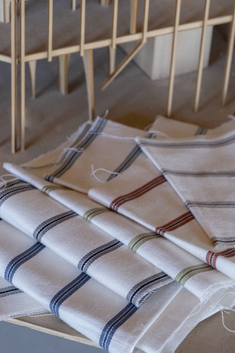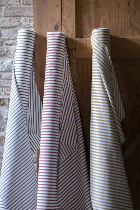 Rina, Shi, Katei : 3種類の非常に汎用性の高いストライプ生地は素朴な仕上がりのリネン100%生地です。どんな空間にも安らぎと静けさを与えるだけでなく、素材の特徴である天然さとエレガンスのエッセンスを完璧に表現しています。