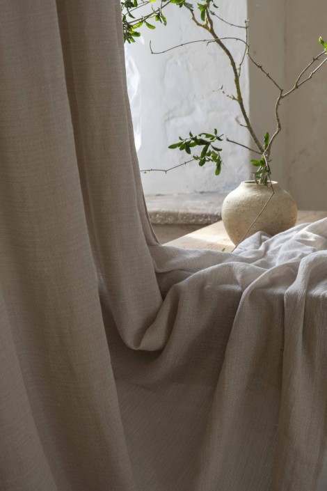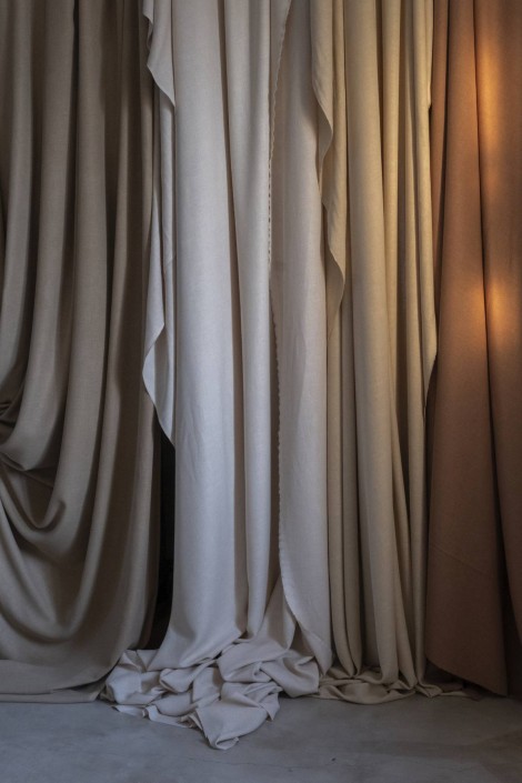 天然繊維を使用した広巾生地はLes Creations de la Maisonブランド共通のアイデンティティです。今回初めて、セルロースから得られる繊維リヨセルをリネンと組み合わせた生地を発表します。ソフトな仕上がりはシルクのように滑らかで美しいドレープが生まれます。カーテン、寝室の装飾に最適で、色展開はすべてのわびさびアイテムと組み合わせられます。