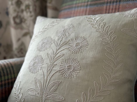 ザクロ、葉、フルーツがおいしそうに刺繍された、緑豊かな庭園のエッセンスを表現しています。 レッドとグリーン、テラコッタとティール、オークルとブルーが、ナチュラルな色合いのベースととブルーグレーのベースに巧みに刺繍され、生き生きとした躍動感あふれるデザインに仕上がっています。